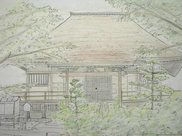 28番から簡単な絵にしようかなと考えていた矢先、ここのお寺の杮拭き(こけらぶき)の屋根をちゃんと描きたくて、結局これまで通りの絵になりました。