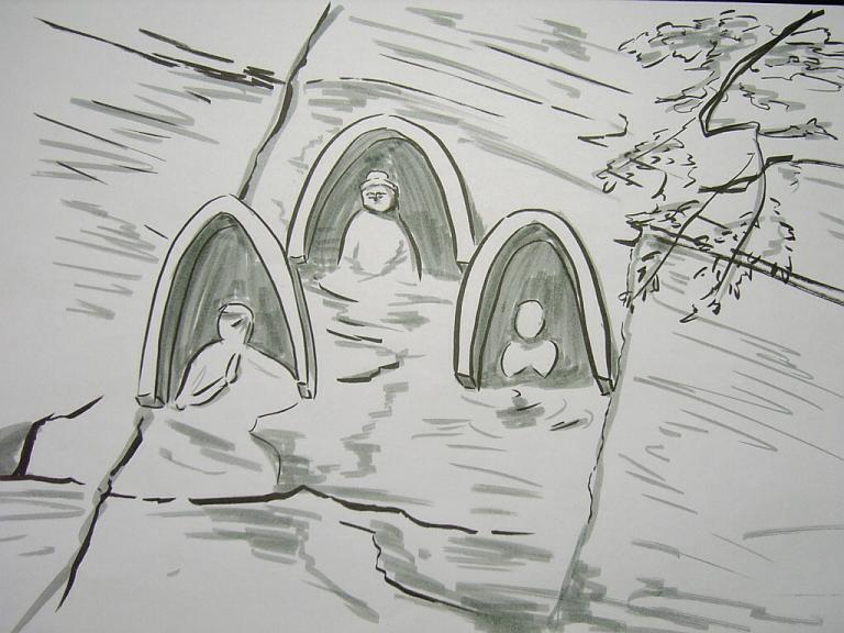 ところで私は、てっきりこのスケッチの磨崖仏が、弘法大師が刻んだものだと思い込んでいたのですが、後でいろいろ調べてもそういう記述は見つけられませんでした。