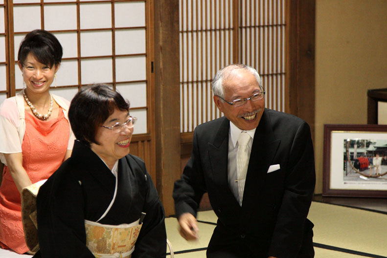 真ん中の床几(しょうぎ)椅子にうちら夫婦が座る。