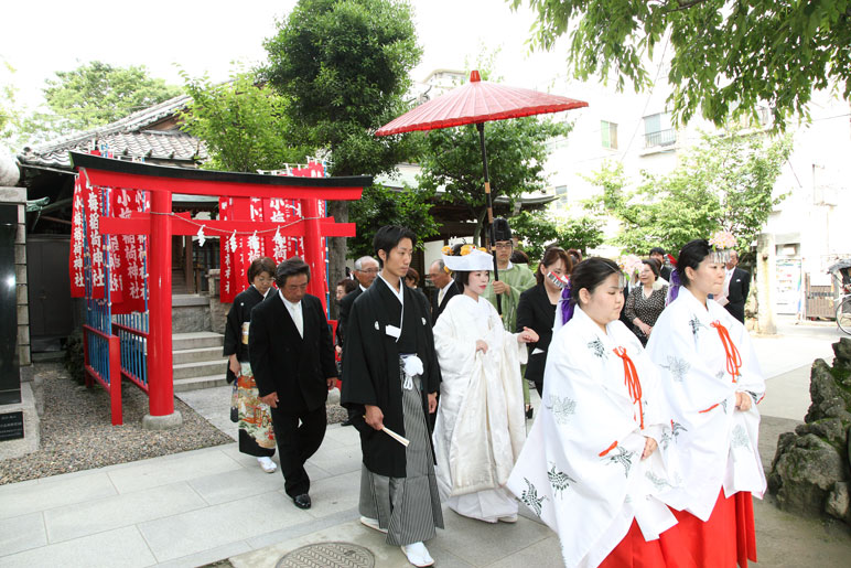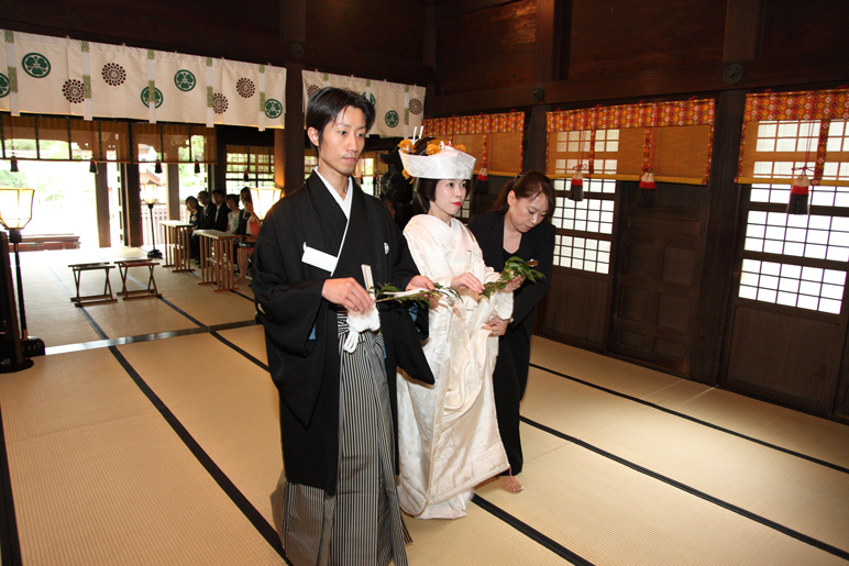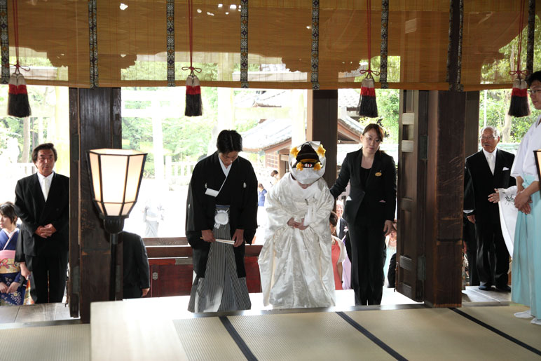入り口に2本の柱があって入るところが3つに分かれて、真ん中から新郎新婦が、社殿向かって右側から新郎親族、左側から新婦親族が入った。