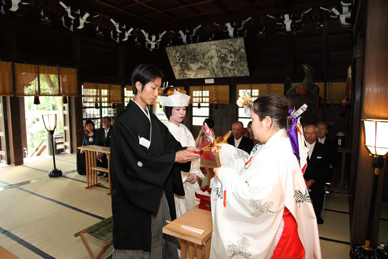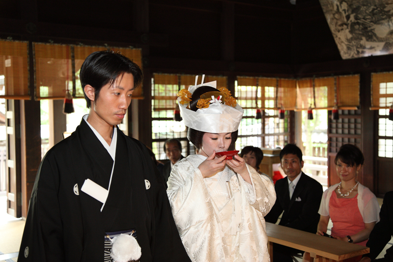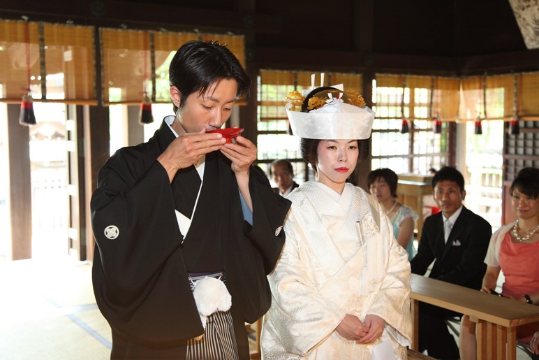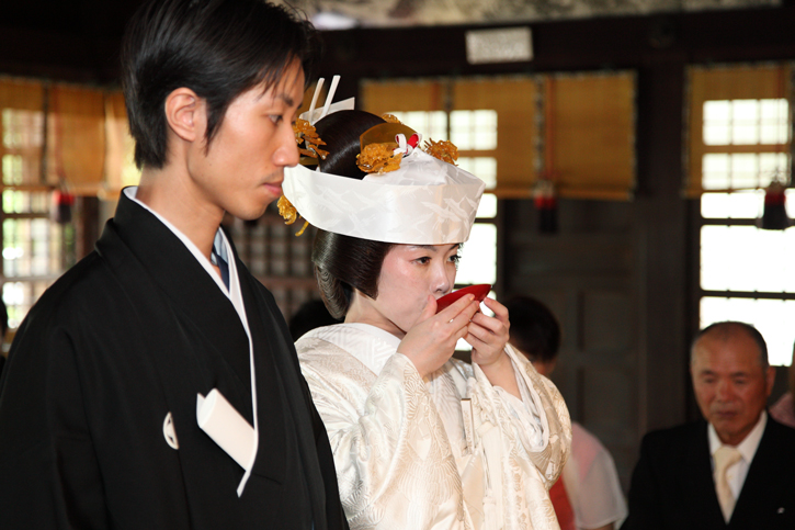 先に新郎が受けて、お酒が注がれて飲み、杯を新婦に渡し、新婦もそれに注がれて飲み、杯を返す。