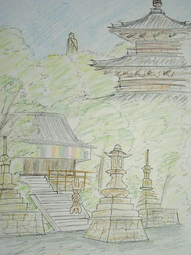 遠くに見える像や五重塔は本当にあるのですが、正確にはこの絵の構図のようにはならないです。