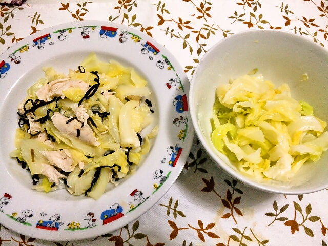 お料理30日目(8月25日) 「ささ身とキャベツの塩昆布あえ/キャベツの中華風あえもの」